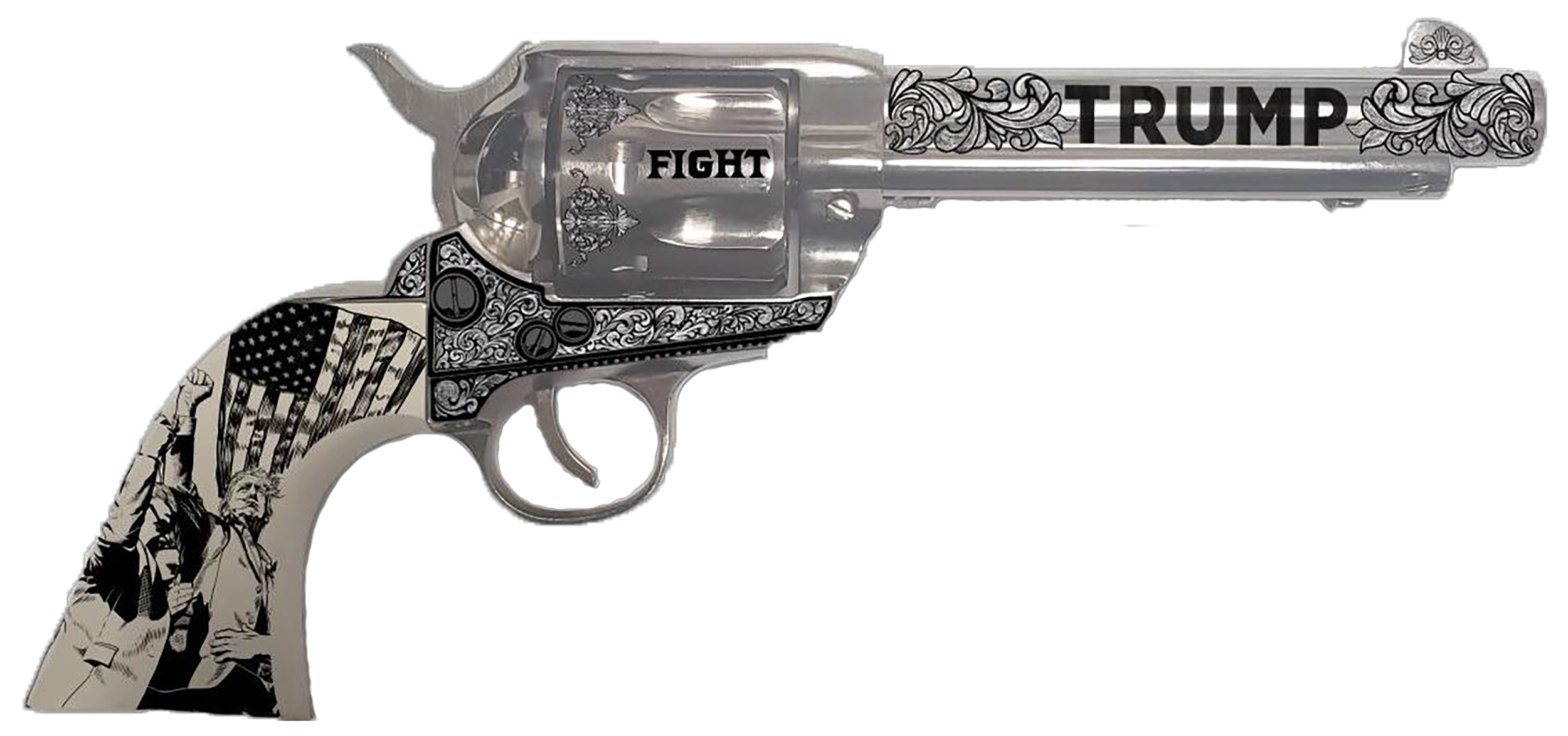 5.5” / 6-ROUND / ENGRAVED NICKEL FRAME WITH “TRUMP”, “FIGHT” & Scrollwork